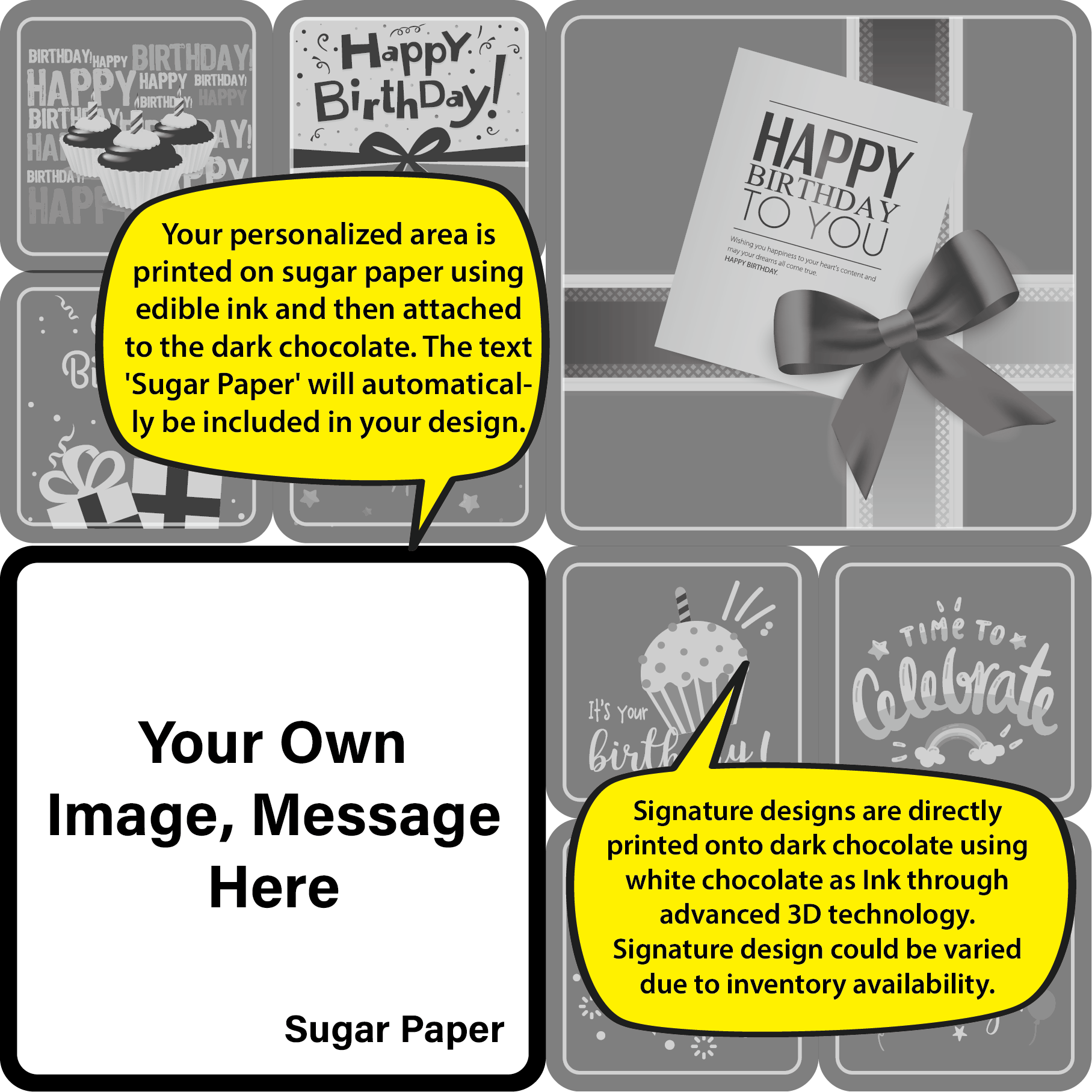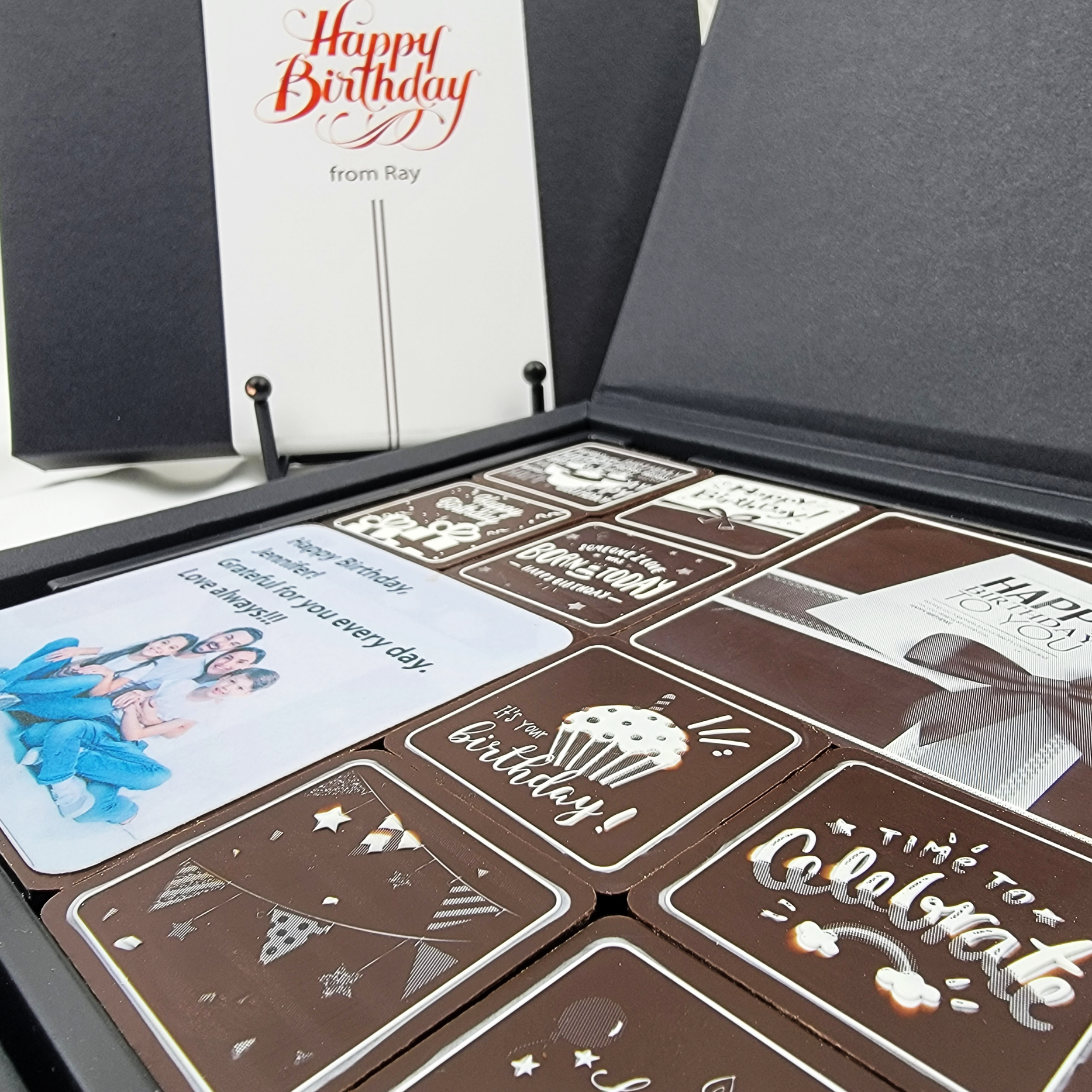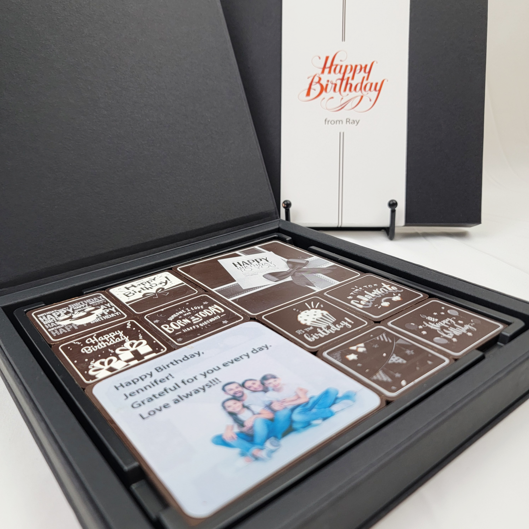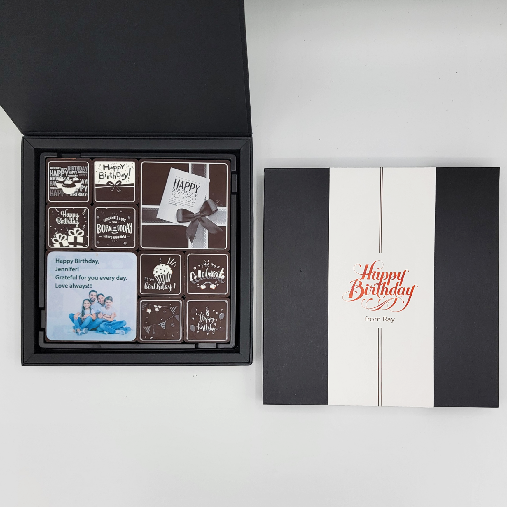 " Ideal for sophisticated adults who appreciate a touch of class, the 'Elegant Soirée Birthday Set' offers a refined take on birthday chocolates. With elegant, understated designs, this set includes luxurious signature chocolates and a customized icing chocolate for a personal message or elegant photo. It’s the perfect choice for anyone who enjoys celebrating their birthday with grace and style. "