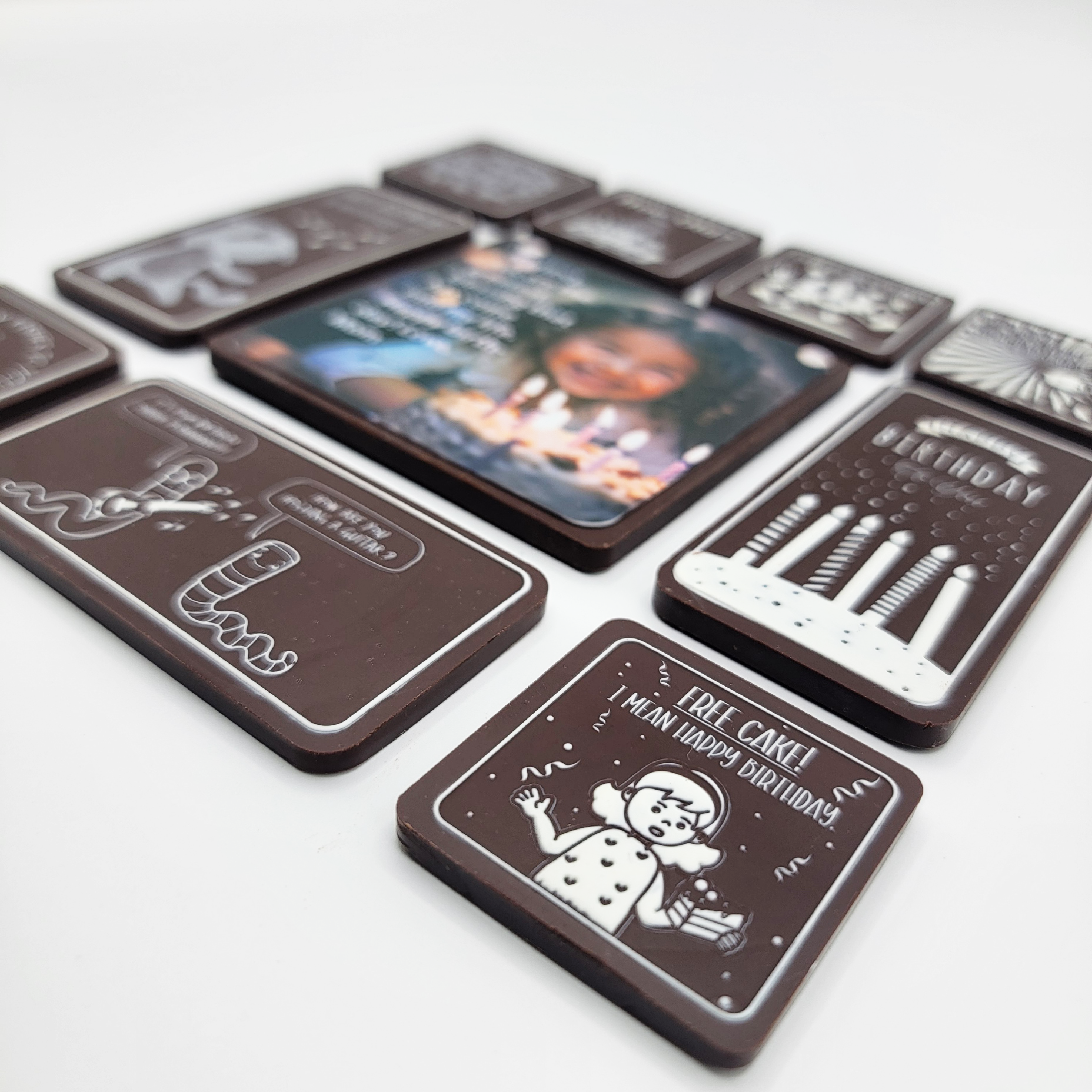 " Perfect for those who love vibrant and festive celebrations, the 'Joyful Celebration Birthday Set' features lively, colorful designs that capture the essence of a party. Each set includes a mix of signature chocolates that embody the joy and excitement of birthdays, along with a piece of personalized icing chocolate that can showcase a name, date, or a playful message. This set turns any birthday into a bright and memorable event. "