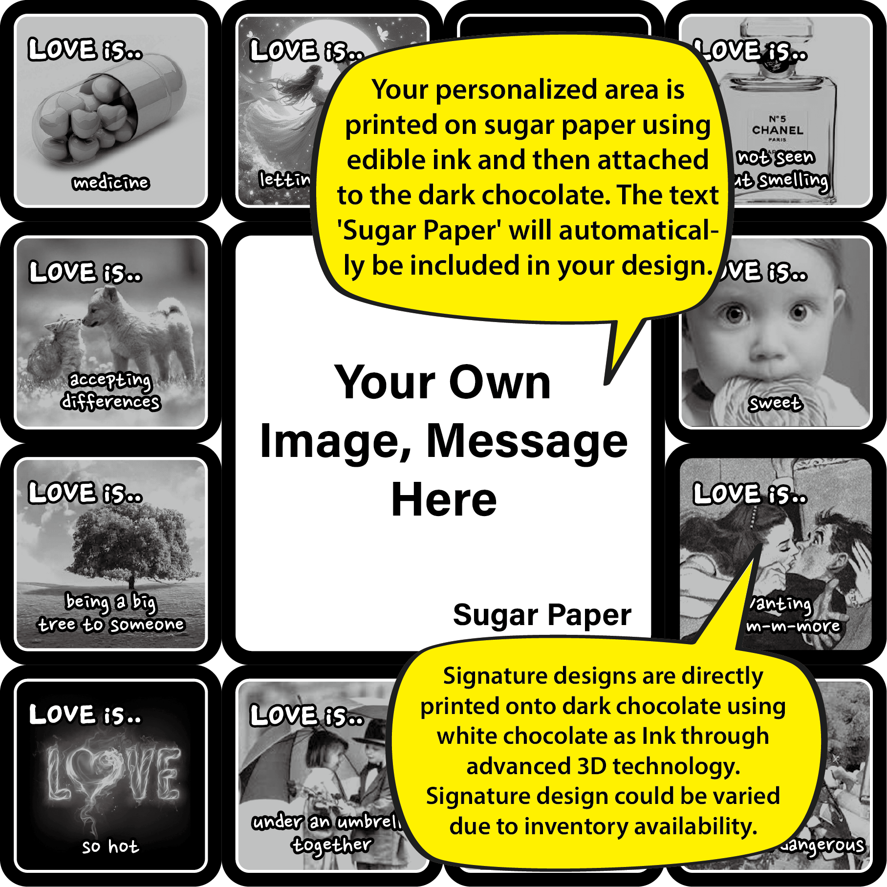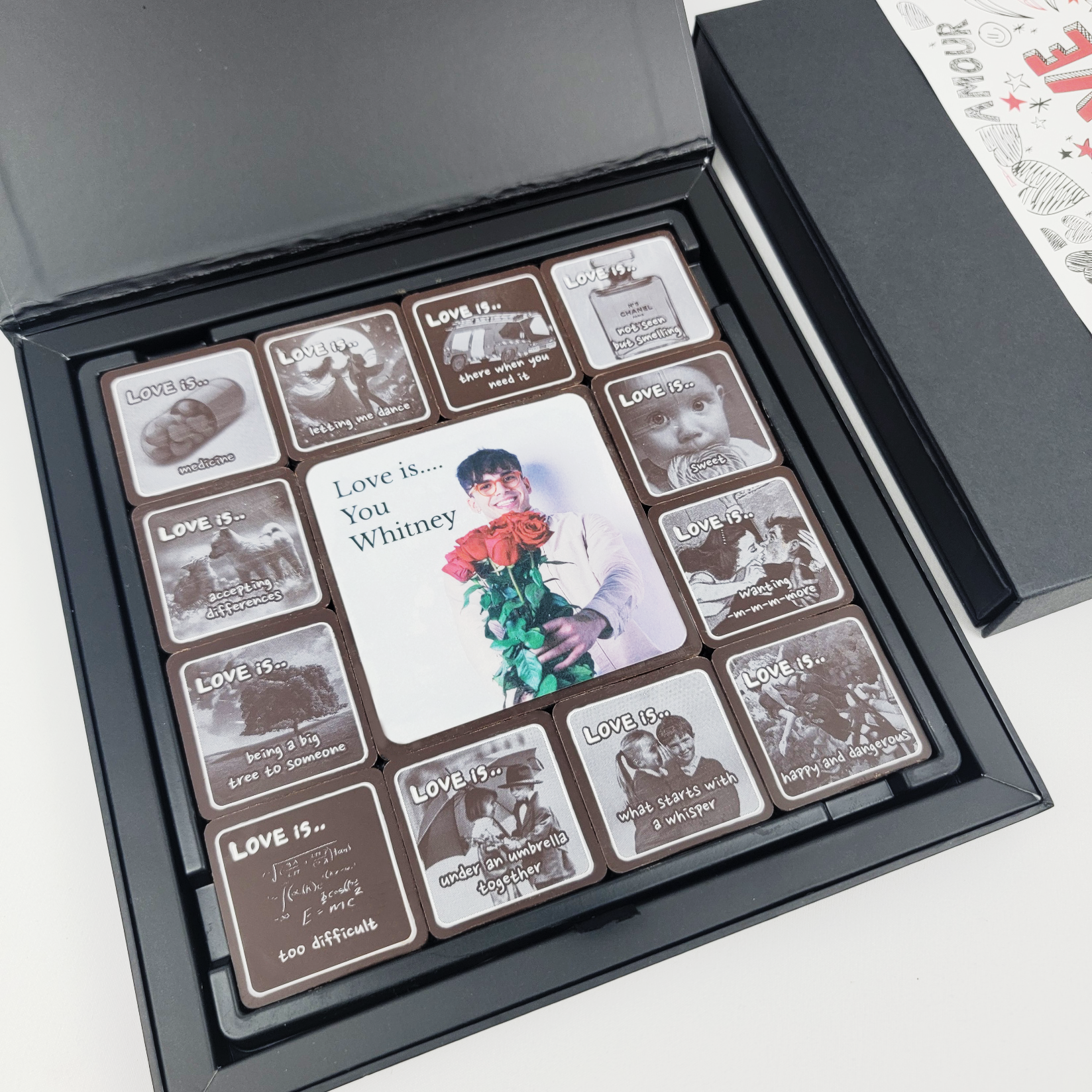 " What is love? Our unique "Love Is..." product is filled with touching and heartfelt messages about love. Each piece of chocolate in this collection carries an inspiring message, making it the perfect way to express your deepest feelings. "