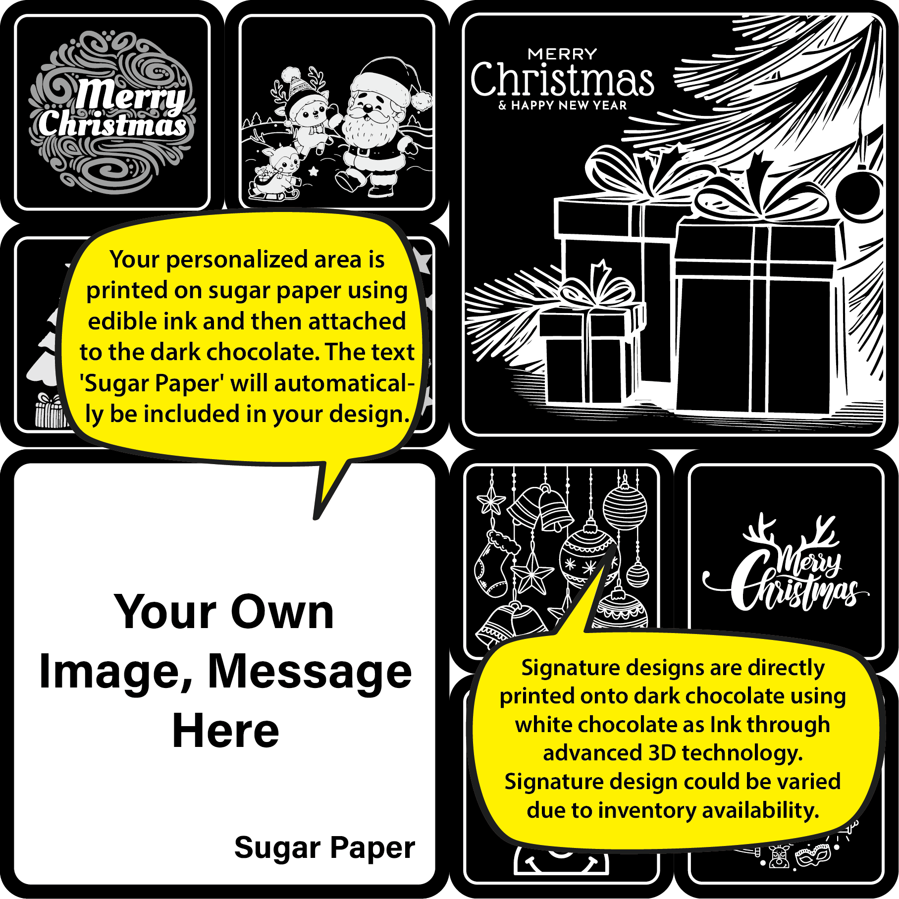 "Delight in the festive spirit with our 'Santa's Joyful Christmas Set'. This collection showcases cheerful Santa Claus motifs, reindeer, and festive decorations. Each chocolate in this set is crafted to bring the joy and excitement of Christmas to life. Add a personal touch with a customized icing chocolate, making it the perfect gift for spreading cheer to loved ones, friends, or colleagues. Celebrate the magic of Santa's season with a sweet and memorable treat."