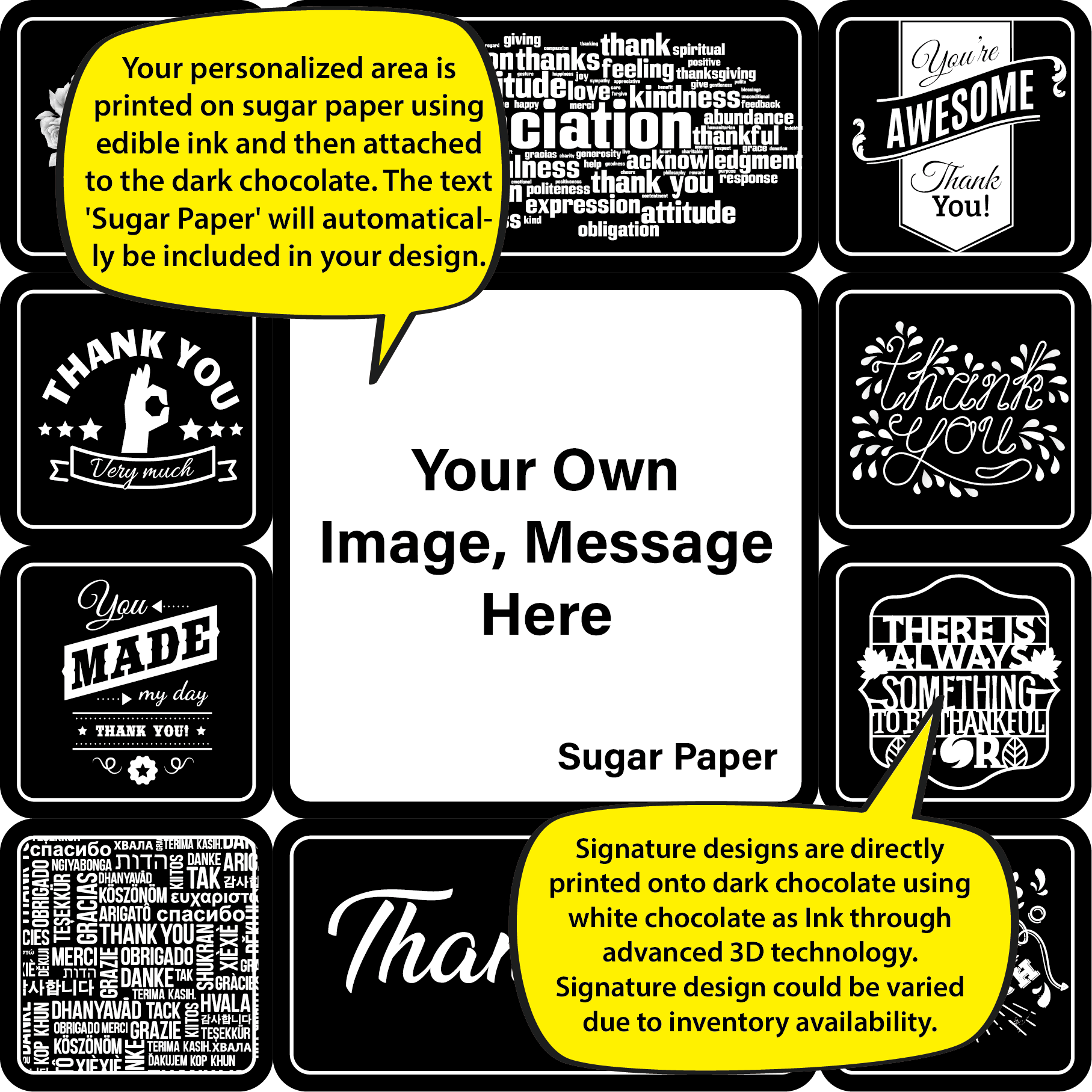 " Show your appreciation in a professional setting with our Professional Gratitude Chocolate Set. Perfect for thanking colleagues, clients, or business partners, these chocolates are designed with elegant and formal motifs. Center piece can be customized with your company logo, a brief message of thanks, or a professional greeting, making it a sophisticated way to express your gratitude. "