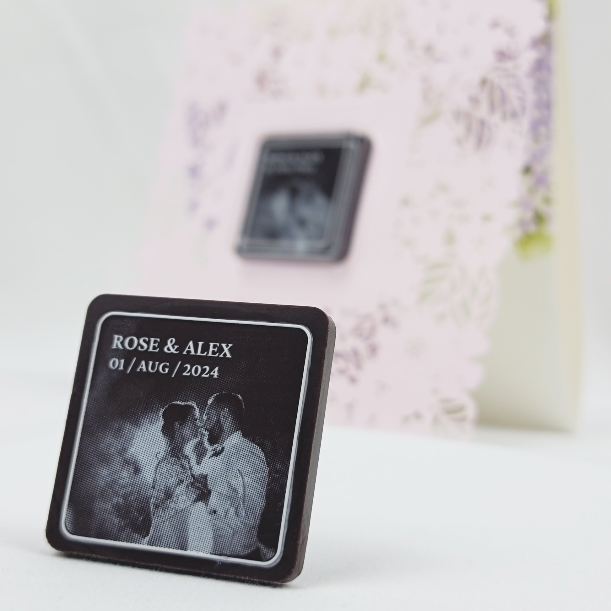 " Introducing our enchanting Customizable Chocolate Wedding Card – a sweet fusion of love and delight. Surprise your loved ones with a beautifully designed wedding card featuring a luscious piece of our finest chocolate, customized with the bride and groom's photo or special message. Crafted with premium dark and white chocolate, this elegant gift adds a magical touch to your special day.
